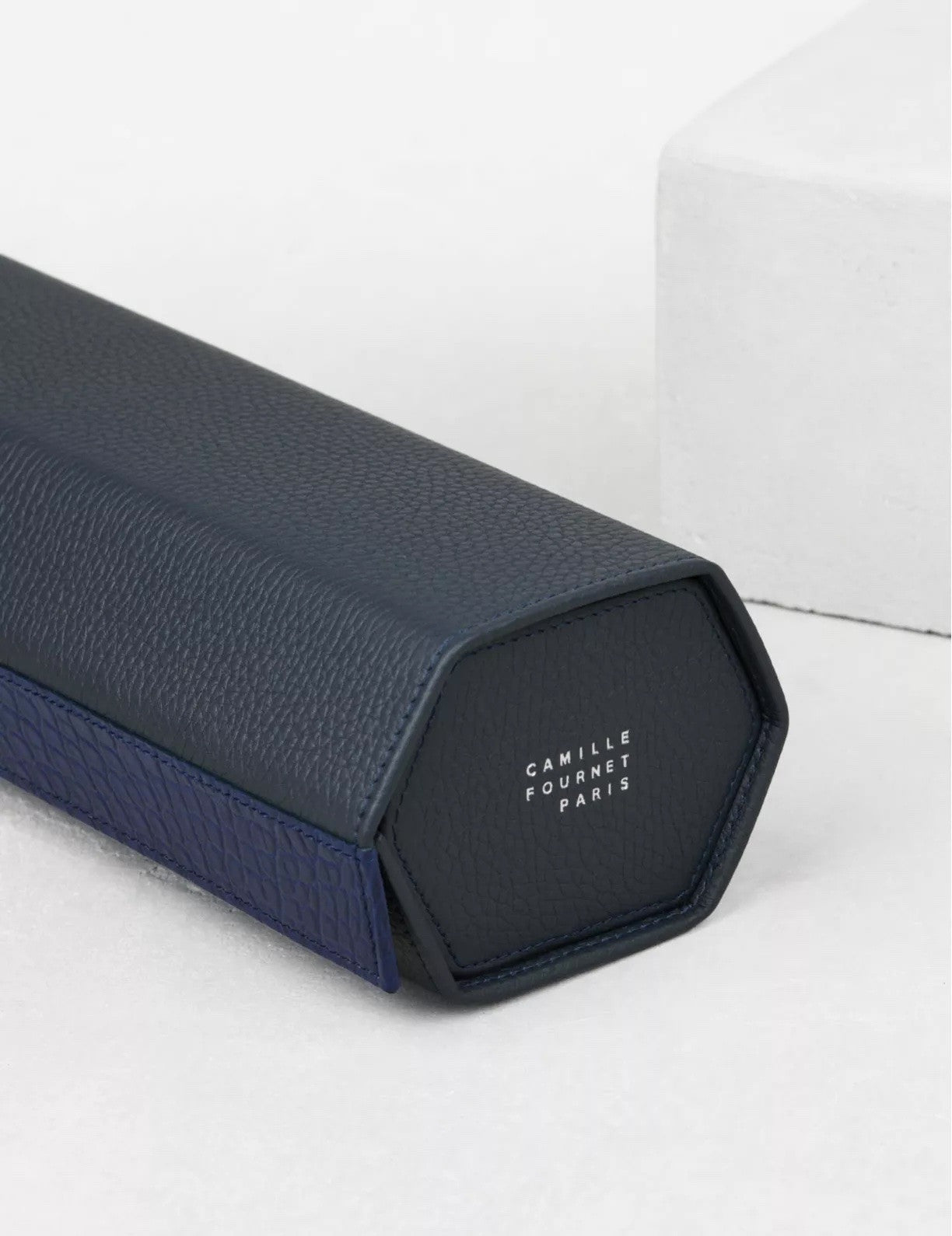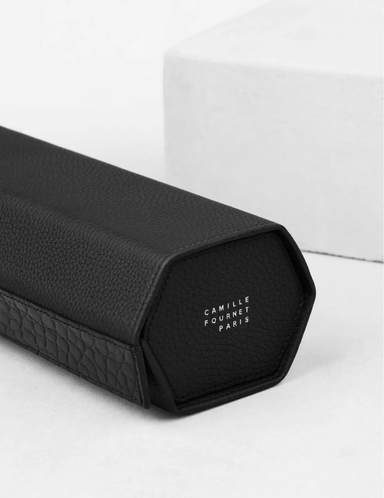 From Camille Fournet in Paris a triple watch case in "Taurillon" bull calf leather and alligator, with a felt lining and a snap button closure.