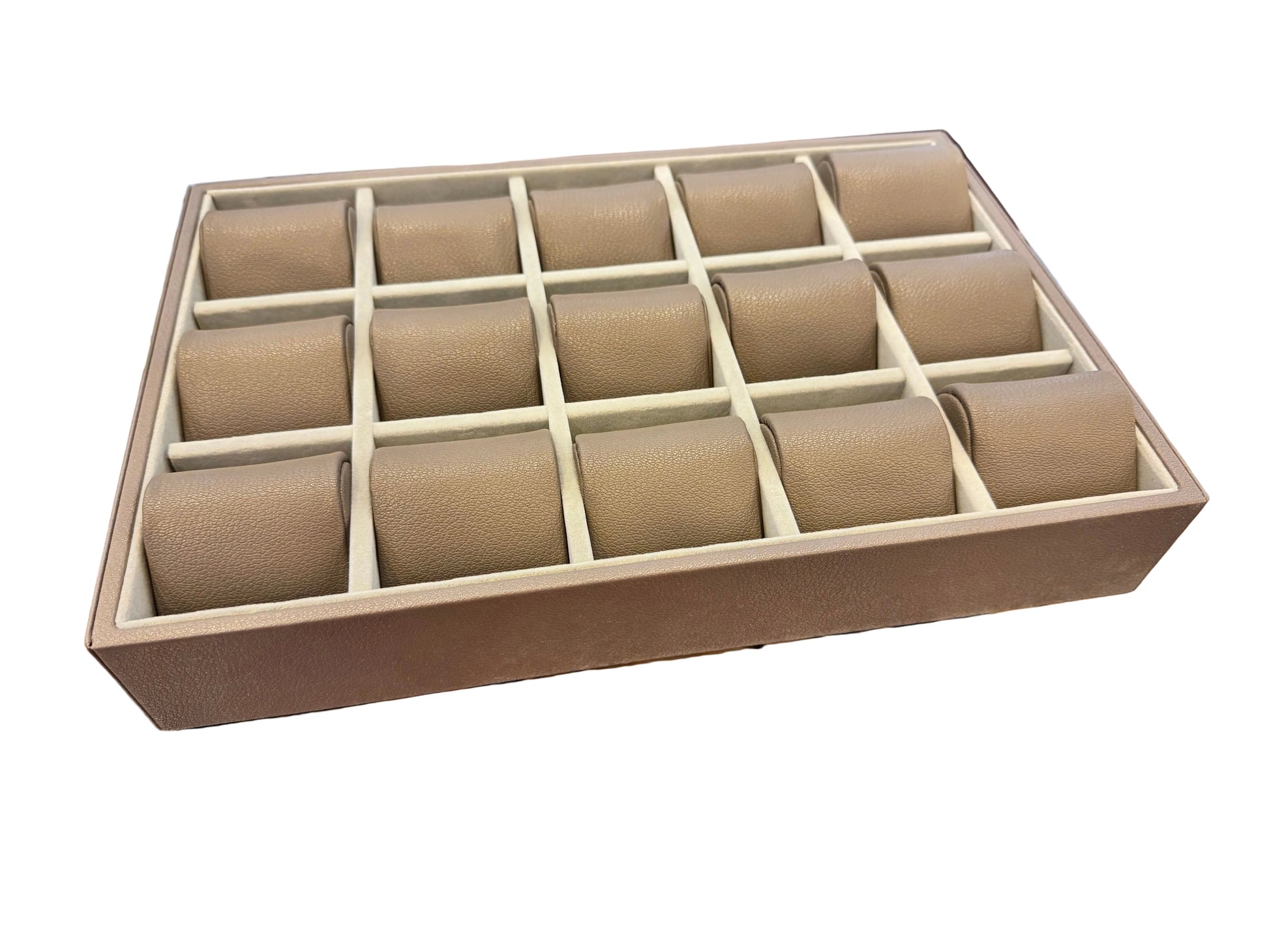 KronoKeeper - 15-Watch Tray: Present your collection with elegance and professionalism. This premium storage tray accommodates 15 watches simultaneously, each resting on a dedicated 65mm wide cushion. Designed for even the most substantial timepieces, it offers ample space with its dimensions of 370 x 245 x 65 mm, ensuring a stable and secure presentation. Ideal for discerning collectors, watch boutiques, and industry professionals, this tray combines functionality with refined aesthetics. The individual cushions protect each watch from scratches while highlighting the details of each piece. An essential accessory for organizing, displaying, and showcasing your horological heritage.