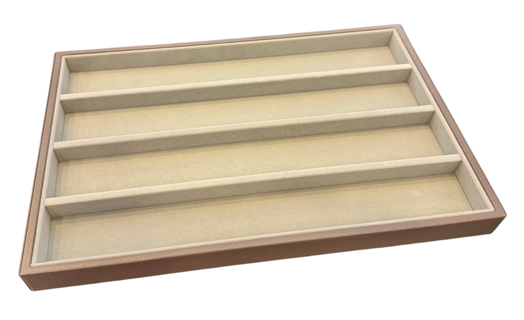 KronoKeeper - 4-Watch Tray is a modular storage system designed for collectors of fine timepieces. This stackable tray, measuring 370 x 245 x 30 mm, accommodates up to four watches horizontally, ensuring optimal preservation of leather straps with deployant clasps, particularly for Patek Philippe and other prestigious brands.